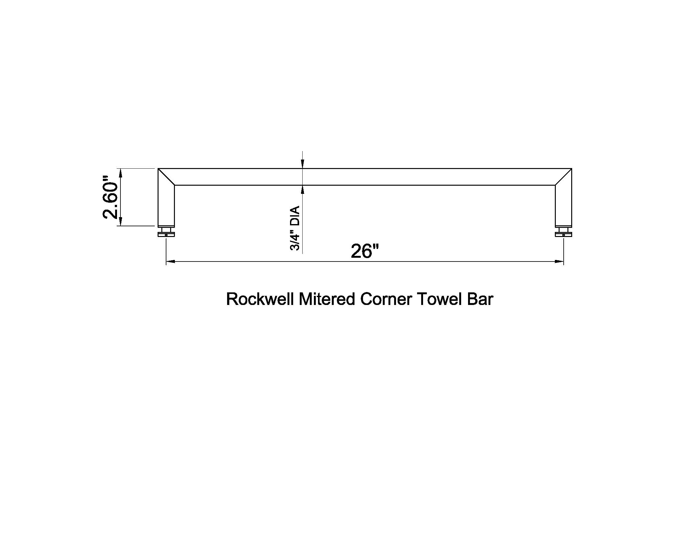 Rockwell 26″ Mitered Corner Single Side Towel Bar in Bronze finish for Glass Shower Doors with 1/2 inch hole diameter 26 inches apart; Diameter: 3/4″ Fits Frameless heavy glass shower doors from 1/4″ to 1/2″ thick; Glass Door Hole specifications: 1/2″ diameter holes 26″ Center to Center; Material: Solid Brass or Stainless Steel shower door towel bars; Suitable for bypass framed or frameless bypass sliding doors with slimline end caps; Easy to install